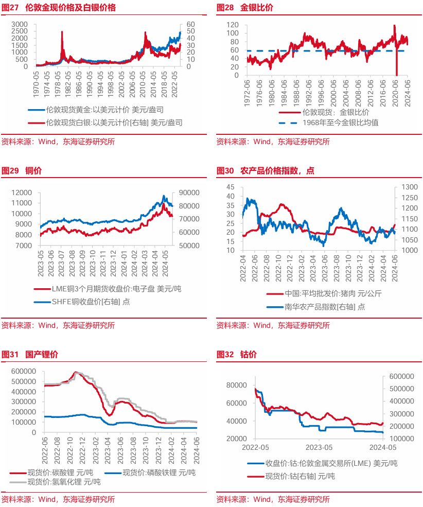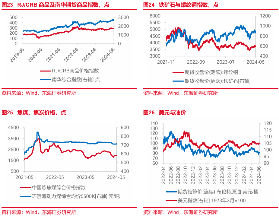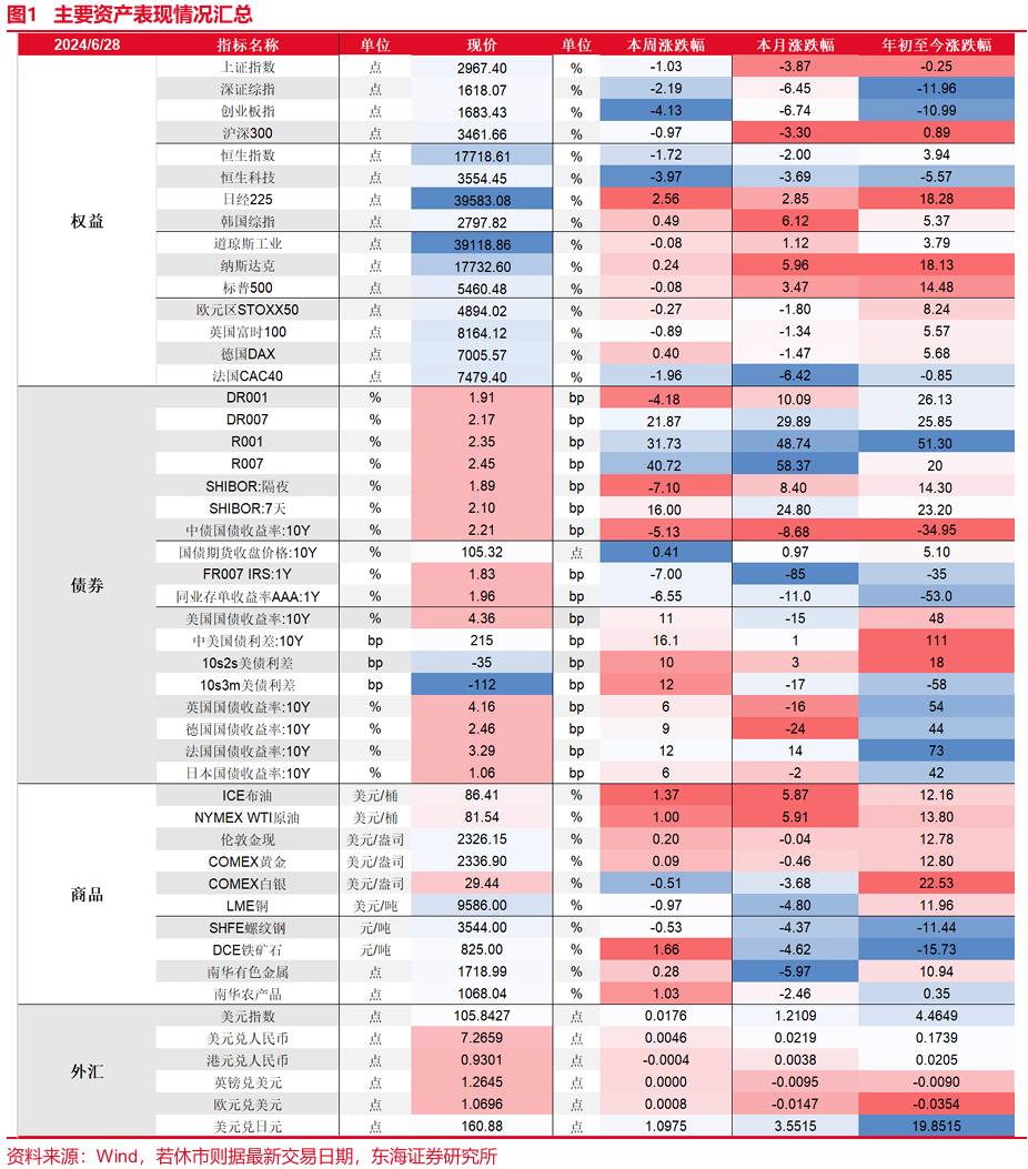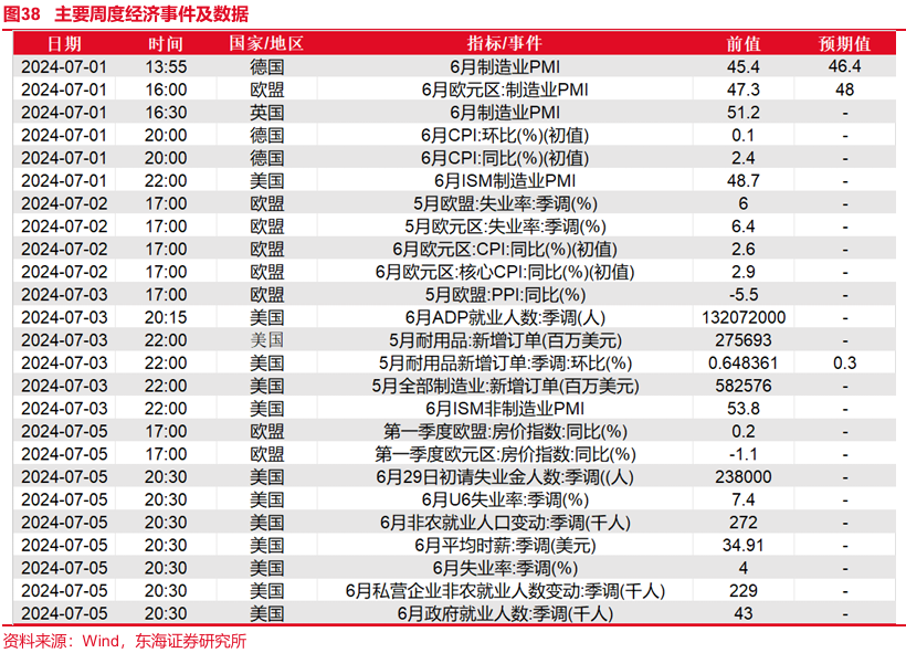 商品方面,原油价格连续三周上行。以色列和黎巴嫩周围日益加剧的地缘政治紧张局势,对美国5月份疲弱经济数据影响形成对冲。至6月21日当周,美国商业原油库存4.607亿桶,周上升359万桶;汽油库存2.339亿桶,周上升265万桶;馏分油库存1.213亿桶,周下降38万桶;美国原油产量1320万桶/天,周环比不变,较去年同期增加100万桶/天。至6月28日,美国钻机数581台,周环比减少7台,较去年同期减少93台;其中采油钻机数479台,周环比减少6台,较去年同期减少66台。