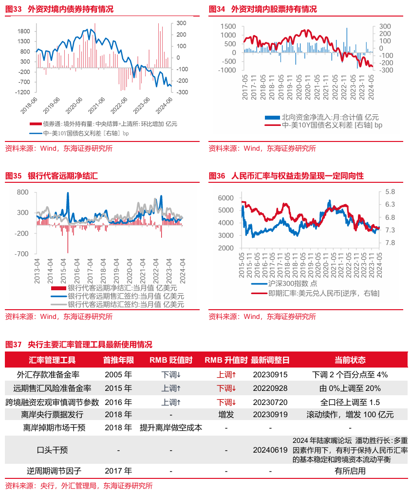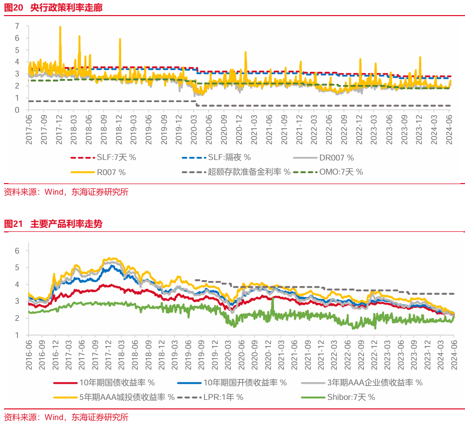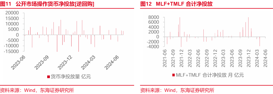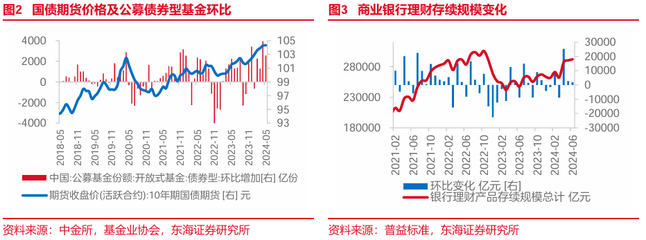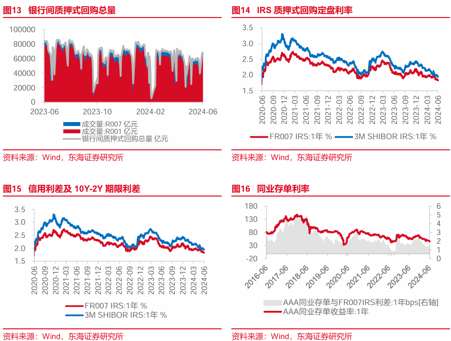 2024年6月,国内利率债市场再度震荡走强。央行行长潘功胜于2024年陆家嘴论坛提到,未来短端政策利率地位或将提升。对MLF利率锚定效应的相对弱化,间接推动广谱利率下行。10Y国债利率收于2.21%,较年初下行34bps。1Y NCD利率下行至2%之下。6月官方制造业PMI录得49.5,连续两月位于荣枯线以下,对债市形成支撑。手工补息对企业活期存款搬家行为影响边际递减。根据普益标准,截至2024年6月23日,全国银行理财存续规模总额为29.19万亿元,较2024年Q1大幅提升2.98万亿元。其中4月、5月及6月分别环比增加2.53万亿元,2656亿元及1800亿元。2024H1政策利率降息落空,但市场利率已明显下行,一定程度其实也起到了“降息”的作用。回顾2022年和2023年均在8月下调MLF利率,而当年利率低点也恰好出现于8月,降息后不久市场表现出利多出尽。故其实政策利率按兵不动,债市做多逻辑的演绎反而可能走得更远。当前政府债发行进度仍然偏慢。后市来看,首先需跟踪三季度政府债供给小脉冲的预期、央行监管层面表态、强美元下汇率掣肘对利率下行空间的约束。同时,经济新旧动能转型下的“资产荒”、广义基金及银保机构的欠配需求、内需仍待修复的基本面及年内未尽宽货币预期仍将对利率下行空间形成支撑。