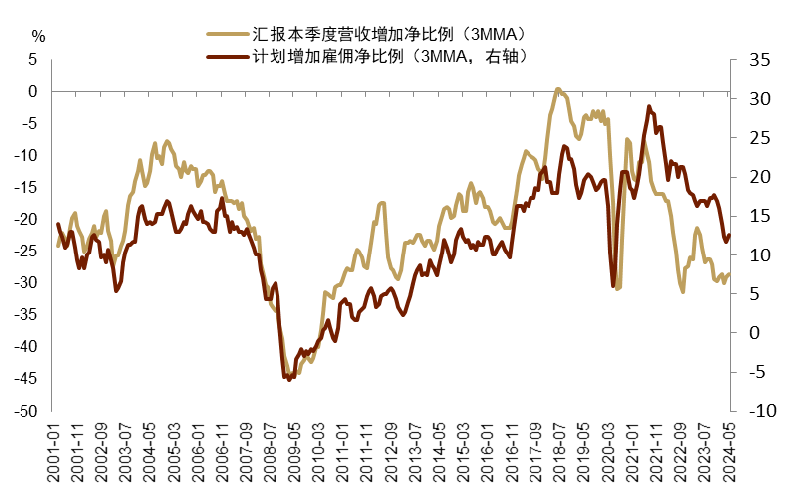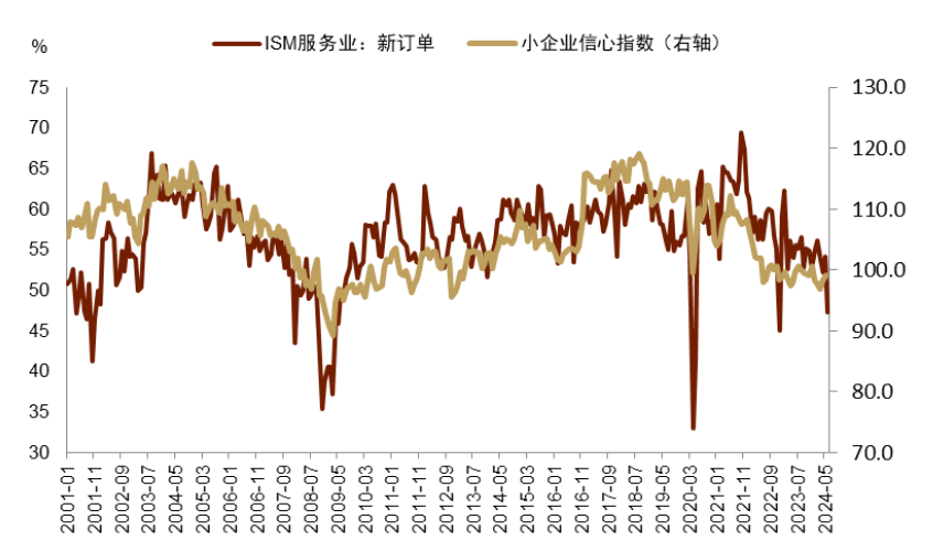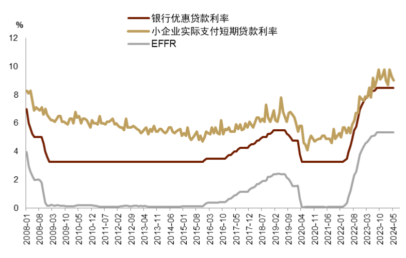 我们认为,小企业的经营和再融资压力或将是接下来使得经济降温的关键因素。从就业市场来看,ADP非农数据显示,50人以下的小企业约占当下美国总雇佣的43%[5]。疫情后至加息前,小企业是雇佣增加的主力军,约占雇佣增量的54%[6],而加息以来,小企业的雇佣增量减缓,近期更是基本停滞(图表7)。Intuit数据显示,10人以下的微型企业雇佣量在今年以来迅速下滑,较去年底损失了50万个就业岗位(图表8)。我们在《“浅降息”的经济逻辑与资产主线》中指出,由于小企业更加依赖银行贷款融资,过去一年多贷款利率维持在9%-10%之间(基本跟政策利率挂钩,见图表9),因而对小企业经营产生较大压力。伴随营收下滑,小企业雇佣意愿趋势走低,带动劳动力市场降温(图表10)。同时,作为更接近需求端的实体,小企业经营情况可能直接影响终端需求,例如其增加库存意愿的下滑与制造业新订单下滑同步,信心指数不振则与服务业新订单下滑同步(图表10,图表11)。