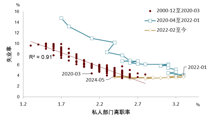 本轮加息以来,失业率并不是美联储的主要关注点。联储理事沃勒在2022年撰文称,由于疫情冲击系统性拉高了职位空缺[1],2022年起加息带来的收紧更多表现在企业减少职位空缺,而并不会带来失业率的抬升。但随着经济边际降温,劳动力市场的调整可能接近尾声,非线性拐点(“inflection point”)可能正在到来。旧金山联储主席戴利表示,劳动力市场的进一步放缓可能导致失业率上升,因为企业将不仅需要调整职位空缺,还需要调整实际工作岗位[2]。美联储主席鲍威尔亦指出,“劳动力市场已朝着平衡迈出了相当大一步”[3]。