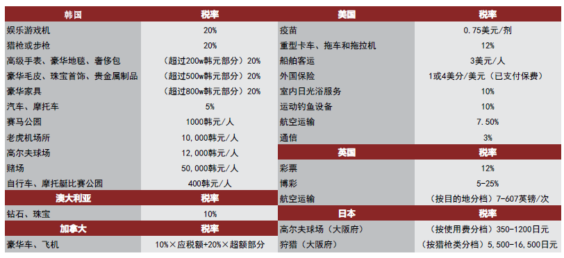 注:发达国家征收消费税,除了综合设置消费税征收范围外,通常还会对特定消费品单独设置法律法规,因此此处统计主要的税目。在OECD的统计标准中,部分符合消费税征收范围的服务类消费并未被列入该税目下,此处统计了其中规模较大的税目。