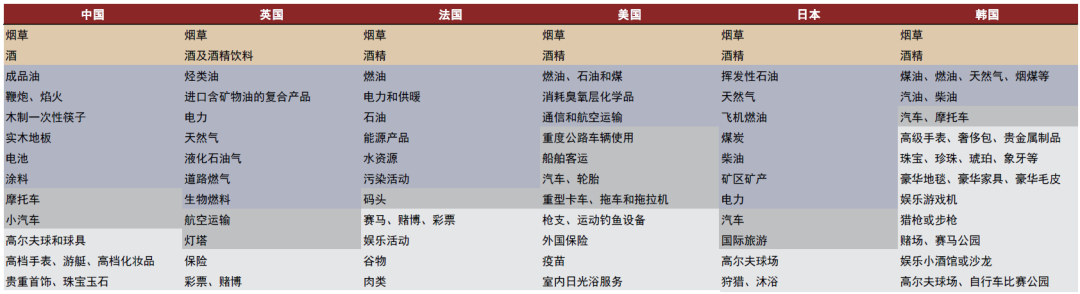 国际上,狭义消费税主要对三类产品征税:烟草、酒精、成品油。不论国内外,烟草都是税收最高的消费品之一,大多数国家对烟草的征税方式为从价从量并行;酒精方面,OECD国家通常会结合产品酒精含量和产品价值设置征税额;成品油属于高污染类消费品,许多国家都对其征收高昂的消费税,征收对象以汽油、柴油最为普遍,此外发达国家对成品油征税范围的规定相对完整,例如英国对烃类油、含矿物油的复合产品、天然气、液化石油气、道路燃气、生物燃料等征税,美国、日本对石油、煤炭也会征收消费税。
