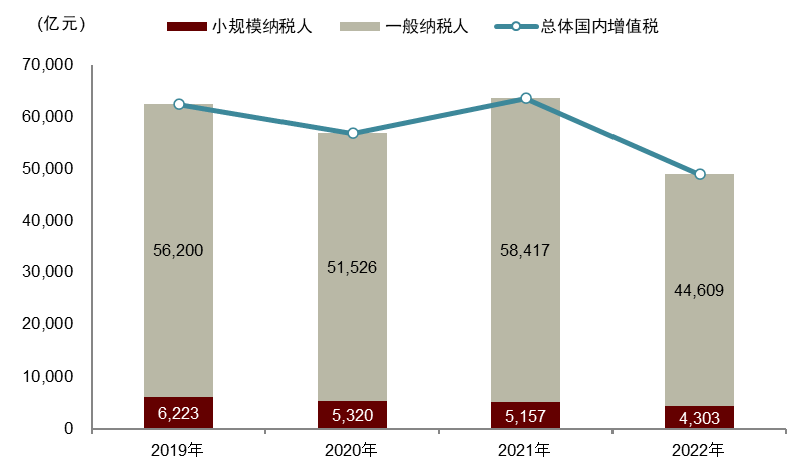近年来,中国政府通过降低增值税税率和简并税率档次来推进增值税改革。其中营改增始自2012年,并于2016年5月全面推开试点,实现了对货物和服务的全覆盖。2018年增值税深化改革启动,四档税率简并为6%、9%、13%三档,税率也有所下调。此外政府还试行了增值税期末留抵税额退税制度,其中2022年的增值税大规模留抵退税(涉及存量和增量留抵税额),为市场主体提供了约1.5万亿元的现金流[5]。