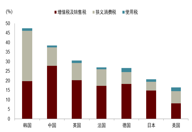 注:美国只征收销售税,韩国同时征收增值税和销售税,其他国家只征收增值税。使用税指对使用某些具有公共属性的物品的行为征税,包括经常性税和非经常性税,前者例如车辆牌照使用、公共水域钓鱼,后者例如排放废气。分类方法参考OECD