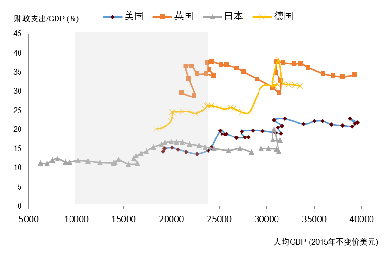 从历史数据看,发达国家在人均GDP在1万-2.5万美元期间,财政支出强度提升相对较快。我们认为,这个阶段或更多对应政府功能转型下对教育科技等支出强度提升,同时随着人口结构逐步老龄化,财政在医疗养老等方面的支出也被动提升。