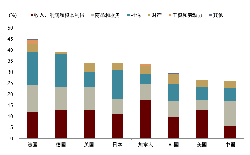 注:中国宏观税负为自行测算,将四大账本收入均做归类,土地使用权出让收入/批租收入做分摊处理,其中财产税为广义概念,涵盖财产的初次购买、交易和持有环节,具体税种包括房产税、契税、耕地占用税、土地增值税、土地批租收入分摊。中国数据为2022年,其他国家为OECD统计的2021年分类数据