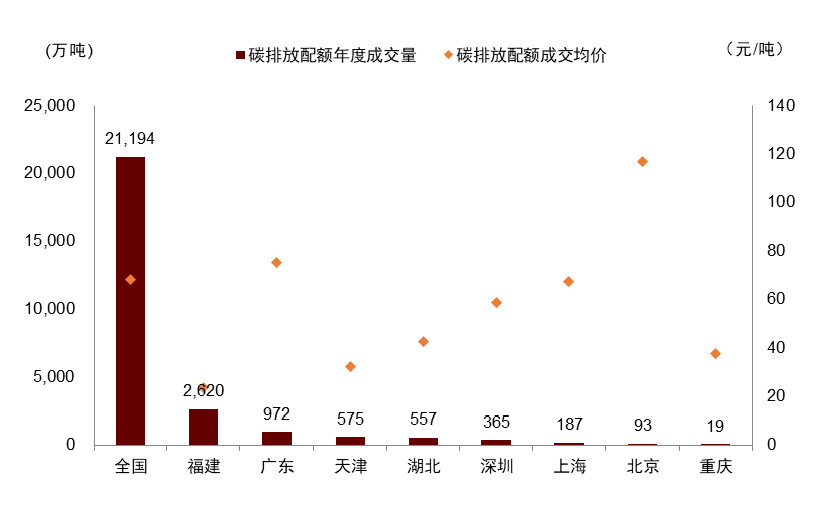 有效调节碳排放的机制主要有碳税与碳交易市场两种,从政策导向看,碳交易市场或是未来促进碳减排的最重要途径。我国目前主要采取碳排放权交易市场的机制,对年度碳排放量达到2.6万吨二氧化碳的企业实施重点配额(CEA)管理。目前正式纳入管理范围的行业只有发电行业,2023年全国碳排放权交易市场覆盖年二氧化碳排放量约51亿吨,约占全国当年二氧化碳排放总量的44%[15],同年我国全国碳市场的碳配额成交量约2.1亿吨,并且成交量集中在下半年,政策驱动特征较为突出,碳市场对全国碳排量的覆盖率、碳市场交易的活跃度均有待提升。“十四五”规划提出将电解铝、水泥、钢铁三大行业纳入碳市场,我们认为未来碳交易市场扩容或将持续推进。碳排放权配额的发放包括免费与拍卖两种方式,我国碳市场正处于相对早期,配额全部是免费发放,但从国际经验与“双碳”目标的紧迫性,以及《政府工作报告》辅导读本“逐步推行免费分配和有偿分配相结合的碳配额分配方式,适时引入有偿分配并逐步提升有偿分配比例”的解读来看,配额下降以及拍卖发放形式占比提升几乎是必然趋势,这也有助于逐步推动碳价上行以及企业降碳行动,并能与欧盟碳边境调节机制(CBAM)逐步接轨。另一方面,推动电价市场化改革,也有利于理顺碳价传导。