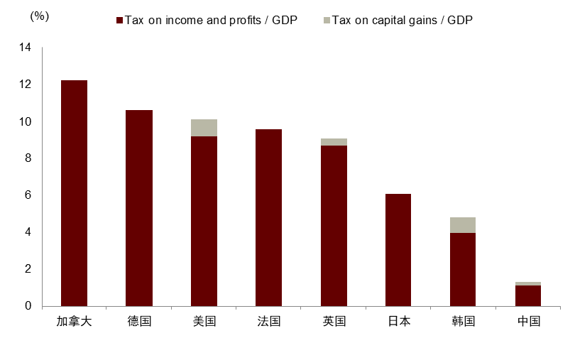 中国个人所得税对GDP比例低于OECD国家水平,今年的政府工作报告辅导读本指出“个人所得税综合所得范围较小”, 与OECD国家平均水平相比,我们个税综合所得征收的范围较窄。海外如美国更多是采取宽税基、起征档低税率的模式。此外,我国个人所得税执行综合所得与分类相结合的征收方式,其中九项个人所得应当缴纳个人所得税的种类中[13],四项实行3%到45%的超额累进税率,经营所得实行5%到35%的累进税率,利息股息红利、财产租赁、财产转让等“资本增值”则适用20%的固定税率,实际中针对劳动征收的税率偏高、针对资本利得征税偏低。