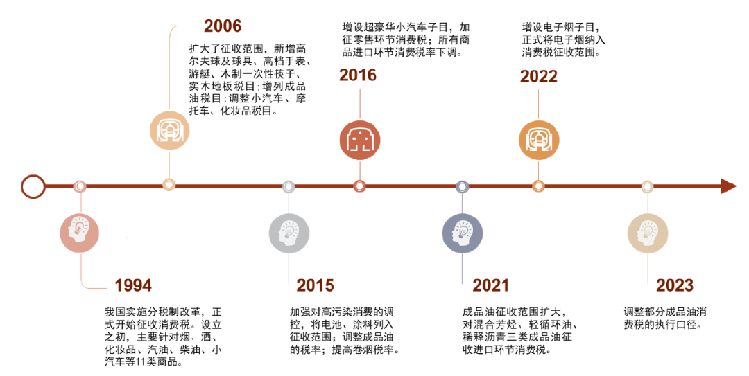 注:2021年,成品油征收范围扩大,对混合芳烃、轻循环油、稀释沥青三类成品油征收进口环节消费税。2022年,烟税目下增设电子烟子目,正式将电子烟纳入消费税征收范围。2023年,调整了部分成品油消费税的执行口径,继续推进在成品油消费税方面的改革。