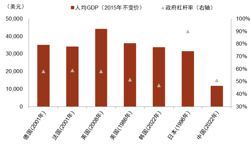中国的一般预算和政府性基金两账户对应的支出增速对人均GDP 增速的弹性平均来看大于1,2023年土地出让收入较大幅度的回落对支出弹性带来一定拖累。而随着土地出让收入逐步企稳,我们认为该比例有望回复至单位弹性以上。不过从国际比较来看,发达国家在接近中国当前政府杠杆率(仅看显性债务)的水平时,人均GDP相对更高。一个不同之处是,当前中国经济处于大转型时期(金融周期下行),经济增速放缓,但经济结构在改善,简单的国际比较可能有失偏颇。不过,这种情况可能也意味着举债纪律在短期可能不会发生根本性变化。