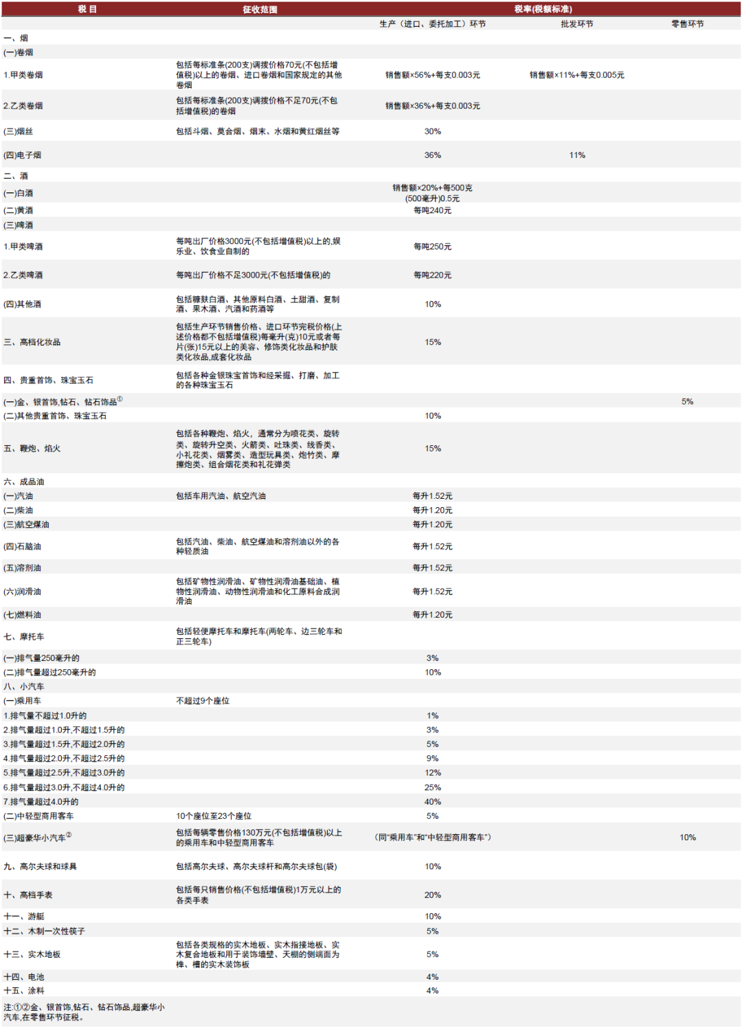 狭义的消费税(Excises)通常指对特定的、需被限制消费的商品和服务征收的税负,由于国内已针对商品和服务普遍开征增值税,因此狭义消费税税基大幅扩大的可能性较低,而是更多聚焦在具有负外部性、影响人们健康、奢侈品类等领域的消费。我国从1994年分税制改革开征消费税,并多次扩充征税范围并提高消费税率(图11),当前烟草、成品油、汽车和酒类产品是主要征税对象。OECD将消费税划分为有限型消费税、中间型消费税、延伸型消费税[10],我国被归类为有限型消费税,即征收的品类相对有限(当前为15种)[11]。