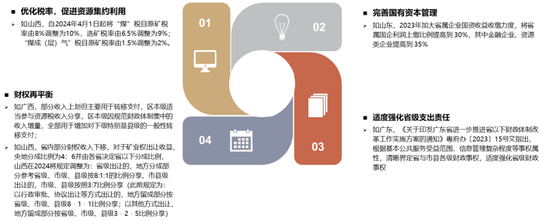 在税收结构优化之外,推动财政资源的综合统筹、理顺财政四本账之间的关系也有助于更好巩固财政收入、减少不必要的财政支出。党的二十大辅导读本的《健全现代预算制度》一文指出,重点在于要按照“以收定支”原则,将“应当由政府统筹使用的政府性基金项目转列一般公共预算”,合理确定国有资本收益上缴比例,并进一步强化增量与存量财政资源统筹、财政拨款收入与非财政拨款收入统筹。而今年年初国务院印发的《关于进一步完善国有资本经营预算制度的意见》提出要进一步完善国有资本收益上交机制,包括扩大国有资本经营预算覆盖范围,健全国有独资企业和国有独资公司收益上交机制,优化国有控股、参股企业国有股收益上交机制和加强国有资本经营预算收入管理等。我们认为未来财政账户的收支统筹有助于更好地巩固财源、提升支出效率。今年各省在预算草案中提到的收支端改革政策也较多,我们在图表26中进行了相应汇总,改革主要是集中在优化资源税等税率、完善国有资本管理、适当强化省级支出责任等。