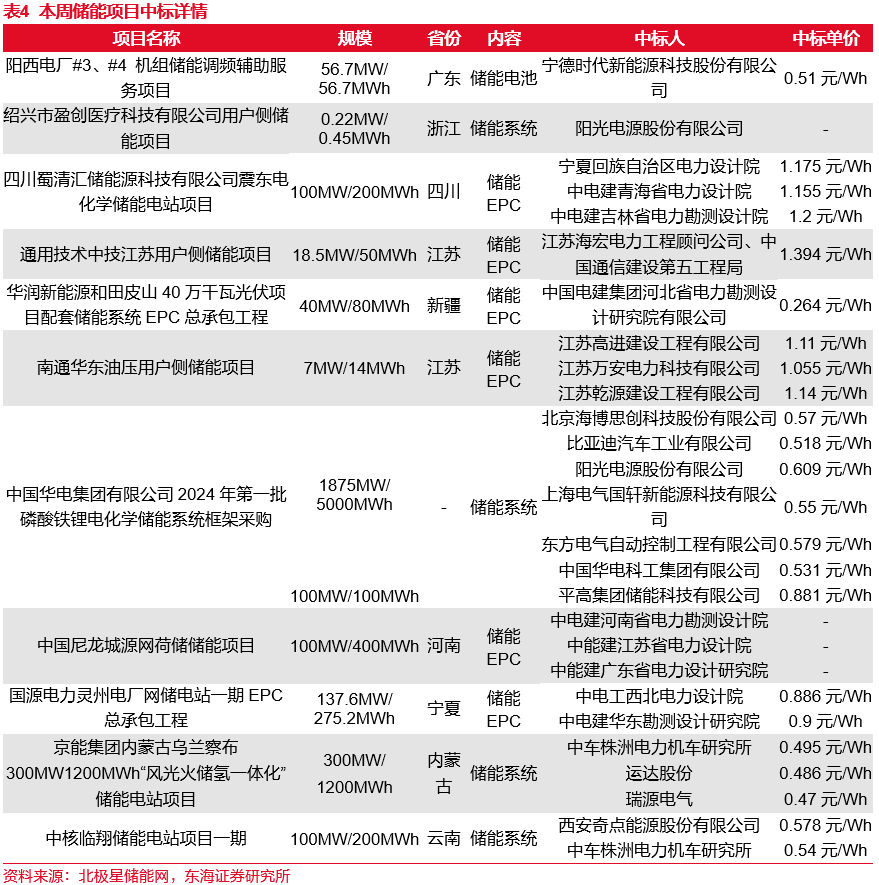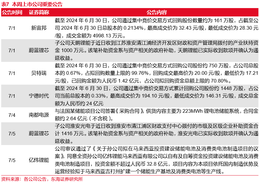 (1)上周新增20个招标项目,11个中标项目。上周(截止7月5日)储能项目招中标总规模为4.04GW/26.51GWh,其中招标项目规模为1.20GW/18.94GWh,需求景气;中标项目规模为2.84GW/7.58GWh;中标价格方面,上周储能EPC中标均价1.05元/Wh,环比持平。