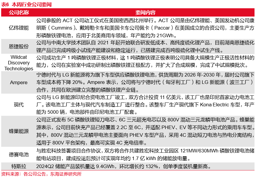 (1)特斯拉销量超预期,行业需求向好。乘联分会:2024年6月新能源乘用车批发销量97万辆,同/环比+28%/+8%,渗透率约50%。海外市场需求逐步恢复,铁锂电池逐步进入欧洲市场:1)特斯拉二季度交付44.4万辆,超出市场预期约2万辆,主要受益于欧美地区交付量恢复;近日LG新能源与雷诺子公司安培签订磷酸铁锂电池供货协议,可生产约60万辆电动车。各车企新能源新产品迭代迅速,对市场销量构成有力支撑,预计2024年全年新能源汽车销量达1150万辆,同比+20.0%。