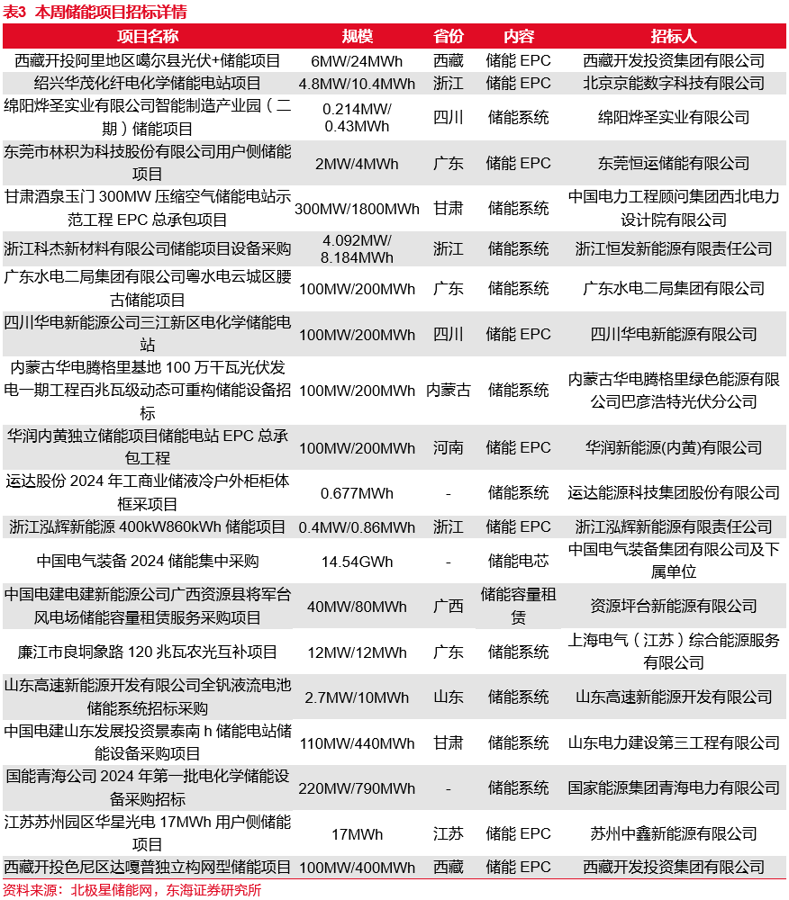1)储能项目招标:上周储能项目招标数量共计20个,包含10个储能系统、8个储能EPC、1个储能电芯和1个储能容量租赁项目;招标规模为1.20GW/18.94GWh,其中规模最大的为中国电气装备2024储能集中采购项目,总规模为14.54GWh。