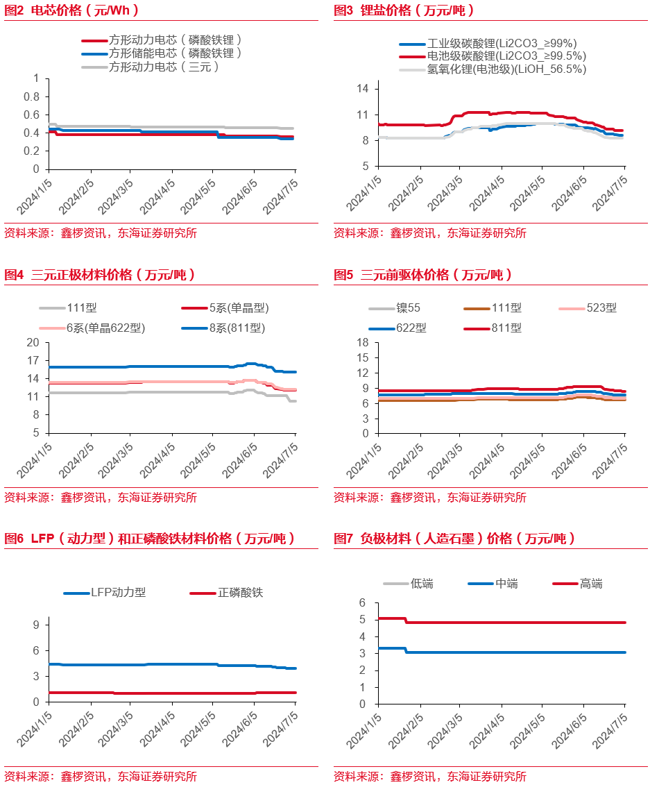 1)电芯:方形动力电芯(铁锂)、方形动力电芯(三元)、方形储能电芯(铁锂)7月5日分别报价0.36元/Wh、0.45元/Wh、0.34元/Wh。