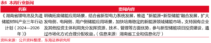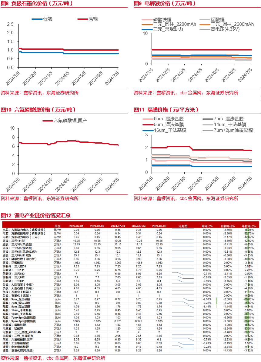 1)锂盐:工业级、电池级碳酸锂供需双方继续深度博弈,价格震荡运;2)正极材料:磷酸铁锂产业在整体供过于求的局面下价格尚未稳定,目前已处于盈亏平衡边缘;三元材料上周价格平稳,但市场价格博弈情绪仍然较浓,后续三元价格仍将震荡运行;3)负极材料:石墨化企业开工率上升,需求边际改善,但价格维持在成本线附近,后续下降空间小;4)隔膜:上周隔膜市场需求稳定,储能和数码淡季影响整体可控,月度排产持平;5)电解液:电解液整体需求稳定,六氟磷酸锂受产能影响价格持续下滑。