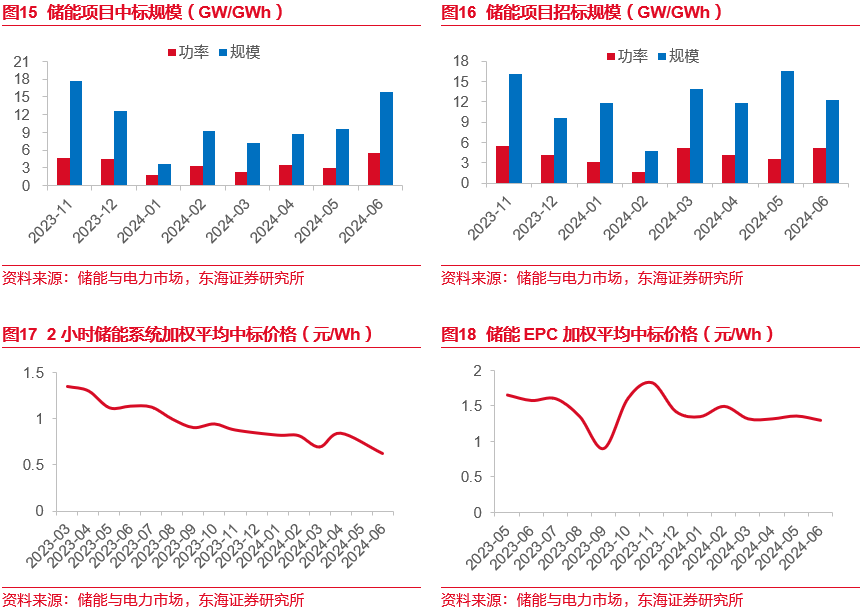 2024年6月储能市场招标量回落。2024年6月全国共计发布储能招标项目48个,规模总计5.24GW/12.32GWh,环比回落;共有42个中标项目,规模总计5.44GW/15.89GWh;中标价格方面,储能系统中标均价持续震荡回落,2小时储能系统中标均价为0.62元/Wh,环比-6.1%;2小时储能EPC价格环比小幅回落,5月份均价为1.30元/Wh。