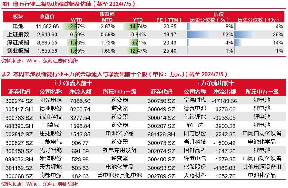 市场表现:上周(7/1-7/7)申万电池板块整体下跌2.67%,跑输沪深300指数1.79个百分点。主力净流入前五为阳光电源、德业股份、锦浪科技、固德威、恩捷股份;净流出前五为宁德时代、德赛电池、亿纬锂能、欣旺达、四方股份。