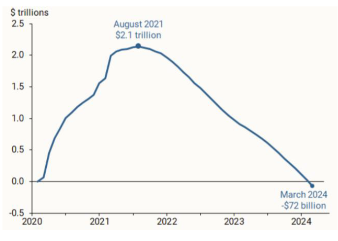 其三,疫情后美国居民消费强劲主要受到政府转移支付形成的超额储蓄支撑,就业市场的韧性也为家庭收入提供了流量支持。但根据旧金山联储最新的测算结果显示,美国居民的超额储蓄已经在2024一季度耗尽,存量资金消耗或削弱居民的消费能力。