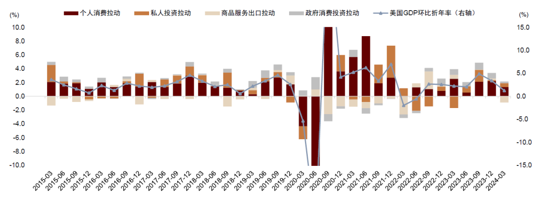 从GDP来看,2023年推升美国经济的关键因素:个人消费和政府投资(分别贡献2023年GDP增长的约60%和30%),在2024年一季度已经明显降温。
