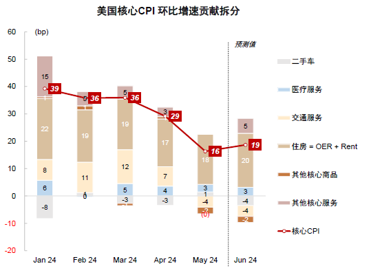 核心CPI环比仍然在20bp区间,主要因为房租通胀继续改善、二手车环比涨幅转负和交通服务转弱。通过环比预测推导同比增速,我们预测6月名义CPI同比降至3.1%,核心CPI同比降至3.4%。