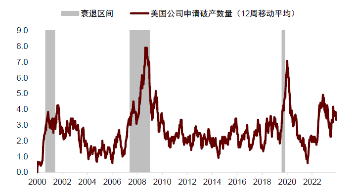 其一,高利率对美国经济的压制可能逐渐凸显。我们不认为美国经济已经对高利率“脱敏”。2023年之所以利率高但是经济保持韧性,是因为财政大幅扩张抵消了货币收缩的压力,并且货币收缩影响经济增长存在一定 “时滞”。进入2024年,居民贷款意愿减弱,破产企业增加,资本支出计划放缓,反映高利率的影响正在逐渐凸显,导致未来经济降温。