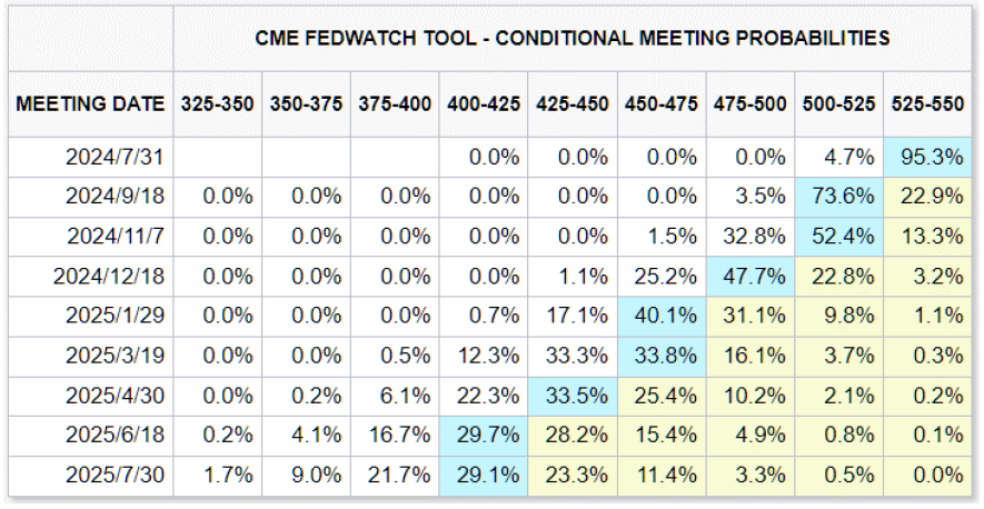 6月27日第一场总统辩论之后,第二次辩论将在9月10日举行,因此大选交易可能在9月份之前进入一段平缓期,市场或重新聚焦美国经济与政策。通胀与增长双双下行,可能为美联储更快启动降息创造条件。如果我们对美国增长与通胀的预测兑现,7-9月期间市场降息预期可能进一步升温,降息交易迎来关键窗口期。当前期货市场计入美联储9月份降息概率为77%,12月再降一次息的概率为74%,对降息预期定价并不充分。