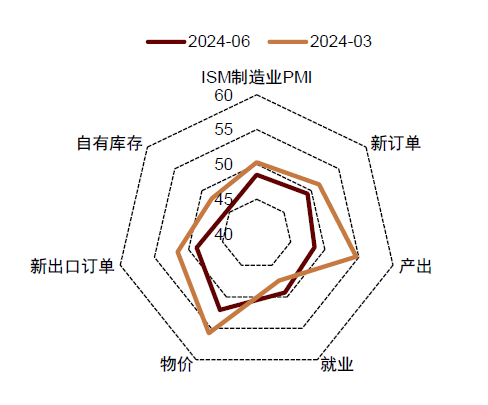 今年1季度美国增长和通胀数据明显反弹,引发市场对美国经济复苏的乐观情绪,同时导致美联储降息时点明显推迟。进入 2 季度后,美国增长数据未能维持增长势头,关键数据普遍掉头下行:6月美国ISM制造业PMI降至48.5,各分项相对3月明显回落,前瞻性指标提示PMI未来可能维持震荡,制造业复苏前景仍待观察。