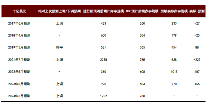 尽管近期CBO大幅上调美国2024财年赤字预期,我们测算能够实际支持经济增长的部分约2600亿美元,且疫情后CBO对美国实际赤字的预测误差常常高达2000-4000亿美元,CBO预测对经济的启示尚待观察。
