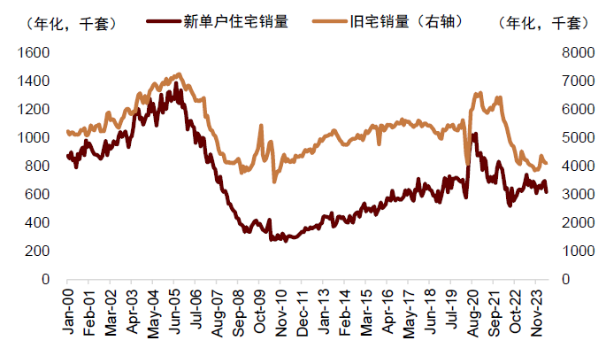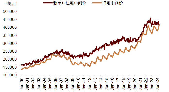 图表14:美国新宅价格高位回落,旧宅价格保持震荡