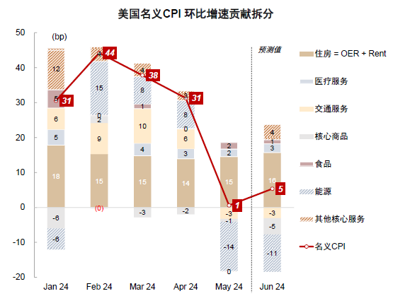 6月美国CPI将于7月11日(周四)公布。中金大类资产预测美国通胀环比仍然偏低。模型预测美国名义CPI环比0.05%(一致预期0.1%,前值0.01%),核心CPI环比0.19%(一致预期0.2%,前值0.16%),略低于市场一致预期。
