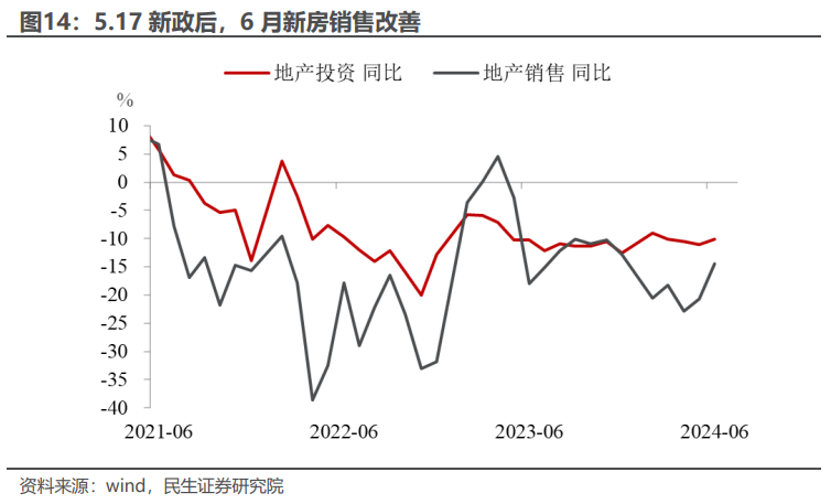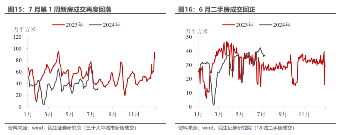 有改善的可能在于5.17新政之后,居民成交意愿在6月有体现。6月的销售面积降幅收窄,资金端中居民预付款和按揭贷款占比较大的其他资金来源较5月出现了向上的变化。实际上,5.17新政对二手房的影响要好于新房,6月的二手房成交面积同比增速已经回正,因为二手房房价下跌得更多,稳地产政策出台后,对居民的吸引力度更高。进入7月,新房和二手房的成交面积都有不同程度的下滑,稳地产政策的持续性有待观察。