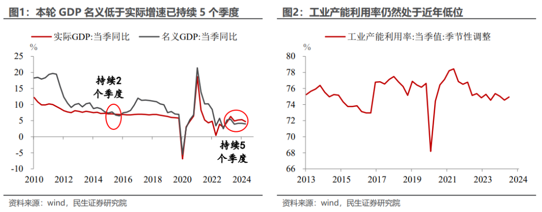 二是名义弱于实际。二季度名义GDP增速4.0%,自去年二季度以来连续第5个季度低于实际GDP增速,需求偏弱、供给偏强、以价换量的局面还在延续。相应的,二季度季调后的工业产能利用率是74.9%,仍然处于近年低位。