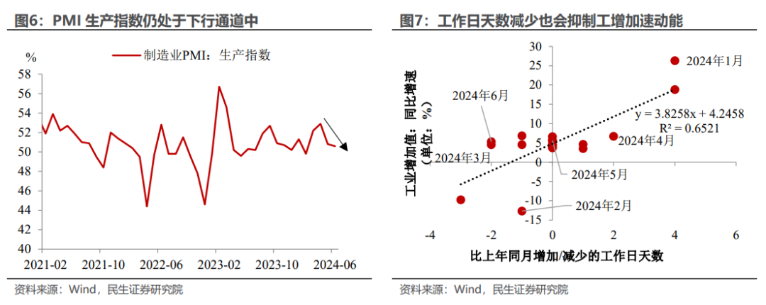 工业生产加速的两大“挡道石”。一方面,产能出清仍为全场的“焦点”——二季度产能利用率虽有所回升、却仍低于过去四年的产能利用率均值。产能利用率的回升说明工业产能出清取得一定成果,但产能利用率整体依旧偏低说明工业供强需弱的问题仍在发酵中,这可能会在一定程度上抑制厂商的生产动能(包括6月进一步下行的PMI生产指数也是另一力证)。另一方面,工作日天数看似“星星之火”、实则“可以燎原”——工业增加值增速的变化时常被工作日天数所左右,5月工作日天数与2023年持平,而6月工作日天数比2023年少了两天,工作日天数的变动导致6月工业生产动能稍显不足。