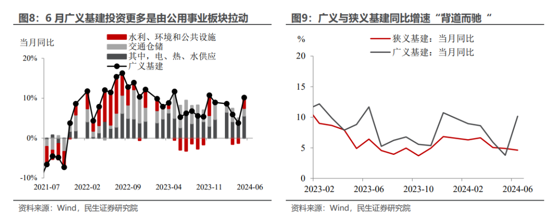 基建:比起广义基建增速,更看广义与狭义基建增速的“背道而驰”。6月广义基建投资同比增速为10.2%(5月为3.8%),成功扭转今年以来基建投资增速持续下滑的局势。通过基建投资细项数据来看,6月广义基建投资增速的上行更多是受到来自于公用事业板块的拉动,这也解释了6月广义与狭义基建投资增速的“背道而驰”——6月剔除公用事业板块的狭义基建投资增速仅为4.6%(5月为4.9%),再续下滑态势。广义基建的“上”说明了由中央投资主导的电、热、水供应是目前基建投资的焦点所在,但狭义基建的“下”说明了基建内生动能依旧偏弱。