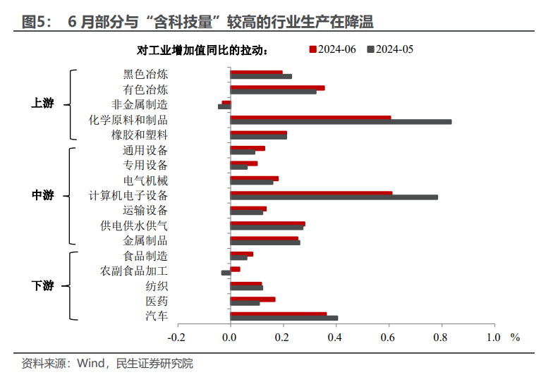 工业:生产动能开始弱化?2024年6月工业增加值同比增速为5.3%(5月为5.6%),似乎再次传达出生产减速的信号。在“新质生产力”的政策号召下,工业生产整体情况受高技术产业影响颇大,高技术产业工增同比从5月的10%降至6月的8.8%,这也是工业生产降温留下的“痕迹”,包括电子设备和汽车两大“含科技量”较高的行业对工增同比的拉动也在减弱。