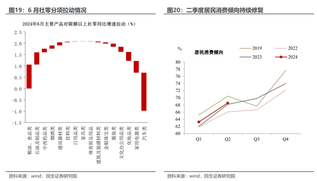 信心和物价的修复是下半年消费的看点。二季度末居民消费倾向继续回升,同比好于2023年但距2019年同期仍有修复空间;而通胀的温和回升也有利于支撑后续名义社零增速。