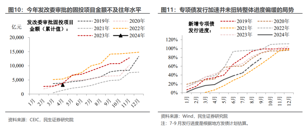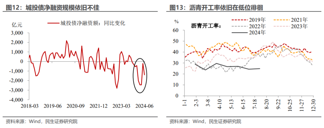 基建既是“顺风而行”、更是“逆风而上”。“顺风”因素包括超长期特别国债开启发行等;“逆风”因素包括发改委审批的固投项目金额并不及往年同期、初夏我国多地恶劣气候影响建筑施工、新增专项债发行虽步入加速通道但整体规模仍不及往年同期、城投债净融资规模降幅继续扩大等。结合近期基建生产端的数据表现来看,可能是“逆风”吹得更猛——譬如沥青开工率远落后于历史同期水平、挖掘机开工小时数也处于历史同期较低位。往后看,基建回升的动能主要源自地方财政的支出力度。