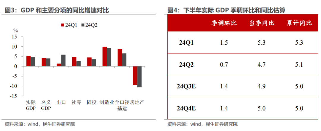 要保证全年经济增速在5%以上,下半年GDP的季调环比不能低于1.4%。假设三、四季度的GDP季调环比均为1.4%,对应同比将分别为4.9%、5.0%,全年经济增速将刚好达到5.0%。