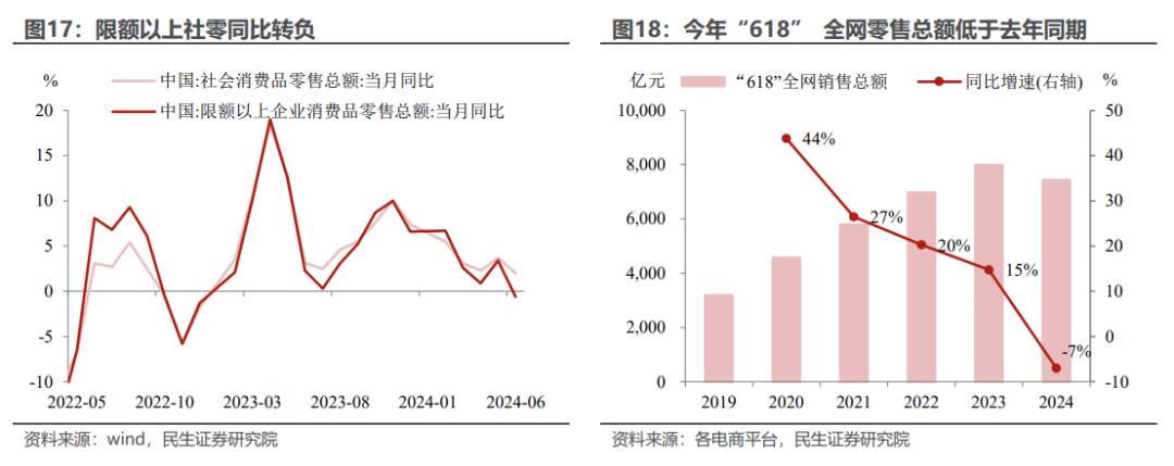 消费:限额以上社零转负,消费走势波动。6月社零同比2.0%略低于预期,主要面临两个“逆风”:一是今年“618”购物节向五月分流,且全网零售总额低于去年同期;二是居民对汽车降价促销持续观望,6月汽车零售同比降幅走阔至6.2%,也是6月限额以上社零转负的原因之一。