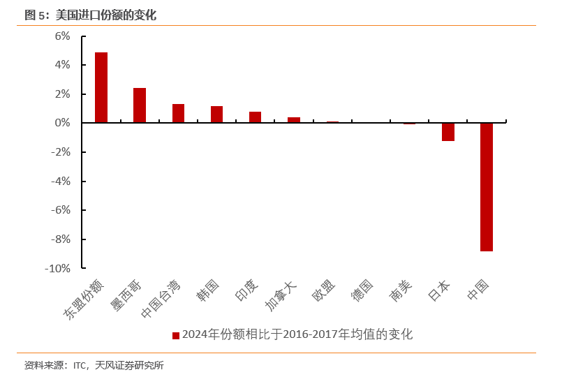 2024年5月,中国(包括中国香港)商品占美国进口份额的12.7%,比2016-17年均值低了9个百分点。减少的对美出口份额,主要流向了东盟、墨西哥、中国台湾、韩国等地区,相关地区对美出口份额分别提高了4.9、2.4、1.3、1.2个百分点。