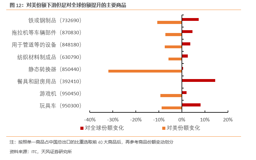 (3)占比36.7%的被加征关税商品:对美和对全球份额均有下滑。