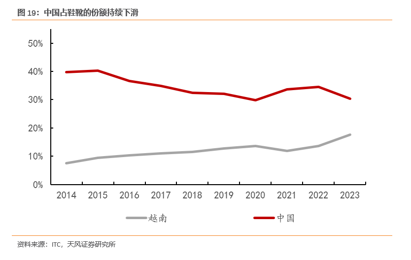 2014年以来,中国鞋靴类商品的全球出口份额就在持续下滑,份额主要流向了越南等东南亚国家,越南鞋靴类(HS64)商品的出口份额提高了6.7个百分点。