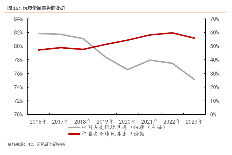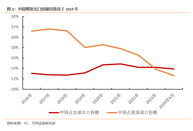 2017年中国占美国进口份额和全球出口份额的21.6%和12.8%。受贸易战影响,2019年中国占美国进口份额下滑至18%,但占全球出口份额上行至13.1%。之后疫情意外爆发又强化了中国的生产优势,到2023年末,中国占全球出口份额达到了14.2%。
