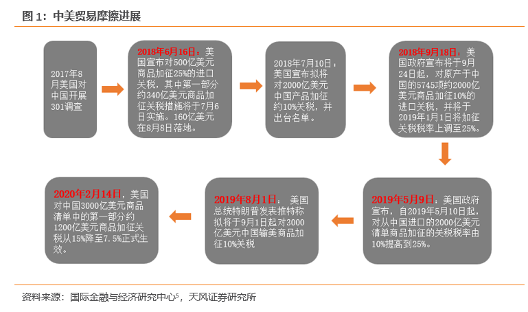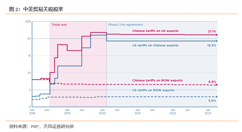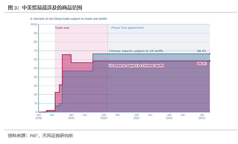 2018-2019年期间,美国对中国出口商品三次提高关税。第一次是2018年6月,美国对中国约500亿美元商品加征25%关税(分为340亿和160亿美元分别加税),占2017年美国进口中国商品总额的10%,覆盖航空航天、机器人和机械等商品。