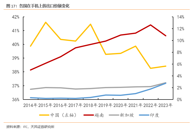 苹果目前在印度的产能占比为7%,其计划在2025年将25%的产能转移至印度。2023年印度、越南占全球手机出口份额比2017年提高了2.5、2个百分点,占美国进口份额提高了11.4、5.2个百分点。