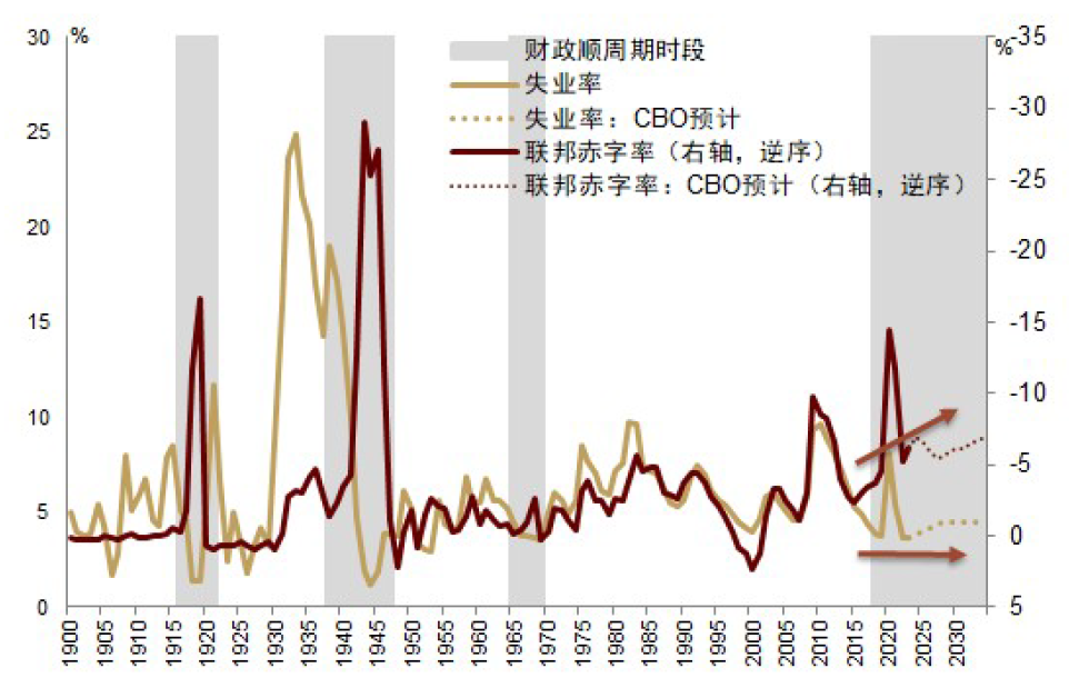 大财政支撑总量、调整结构。功能性财政正逐步替代平衡性财政,以解决1980年代以来逐渐积累下来的产业空心化和贫富差距等问题。顺周期的财政赤字对总需求起到支撑作用(图表5),而财政主导的环境可能从根本上改变定价逻辑。我们在《提前降息,低利率时代的确认终结》中指出,2008年后的货币扩张和“金融化”时期,泛滥的流动性(“便宜钱”)热衷于寻找成长性,且低利率有利于行业领军企业通过融资扩张形成行业垄断,而不利于在融资上不具优势的中小企业。但财政主导下,利率中枢上移,结束廉价融资,功能性的财政支出则着力重建美国本土产业链,相当于绕过金融市场将财政资金通过补贴和订单的方式直接投放至生产环节,进而创造一个有利于中小企业和制造业发展的环境。