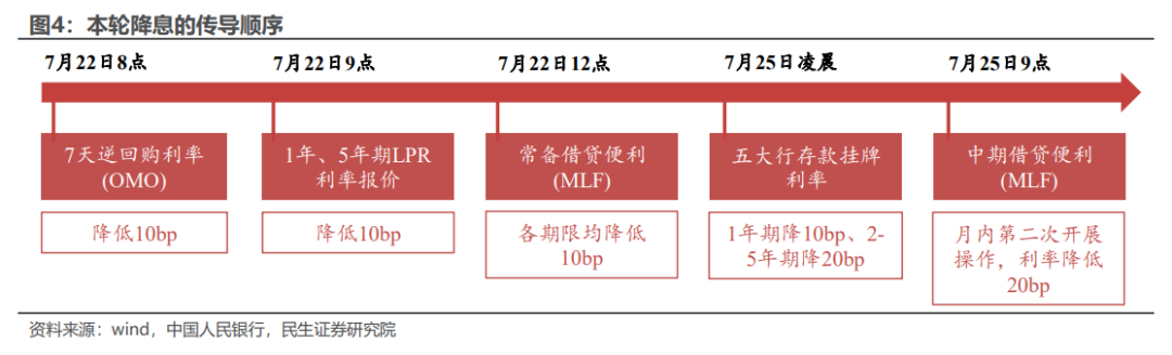 此外,随着今天五大行存款利率的调降,新的利率传导体系也完成“首秀”:“7天OMO利率→LPR利率→存款挂牌利率→MLF利率”可能成为后续降息链条的重要参考,这意味着后续的降息的观察窗口有所改变,可能由此前每月15号的“MLF操作”更替至20号的“LPR操作”,但也不排除央行在每日开展逆回购公告中“先行”调整利率。