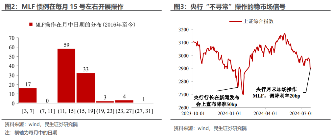 二是以史为鉴,央行的“不寻常”操作通常有“稳预期”作用。类似今年年初1月在市场连续调整下降准的超预期公布,这次本可在8月中旬跟随调降的MLF却前置到7月下旬“加场”操作,这与年初央行通过货币先行来“稳市场”的政策考量“异曲同工”。